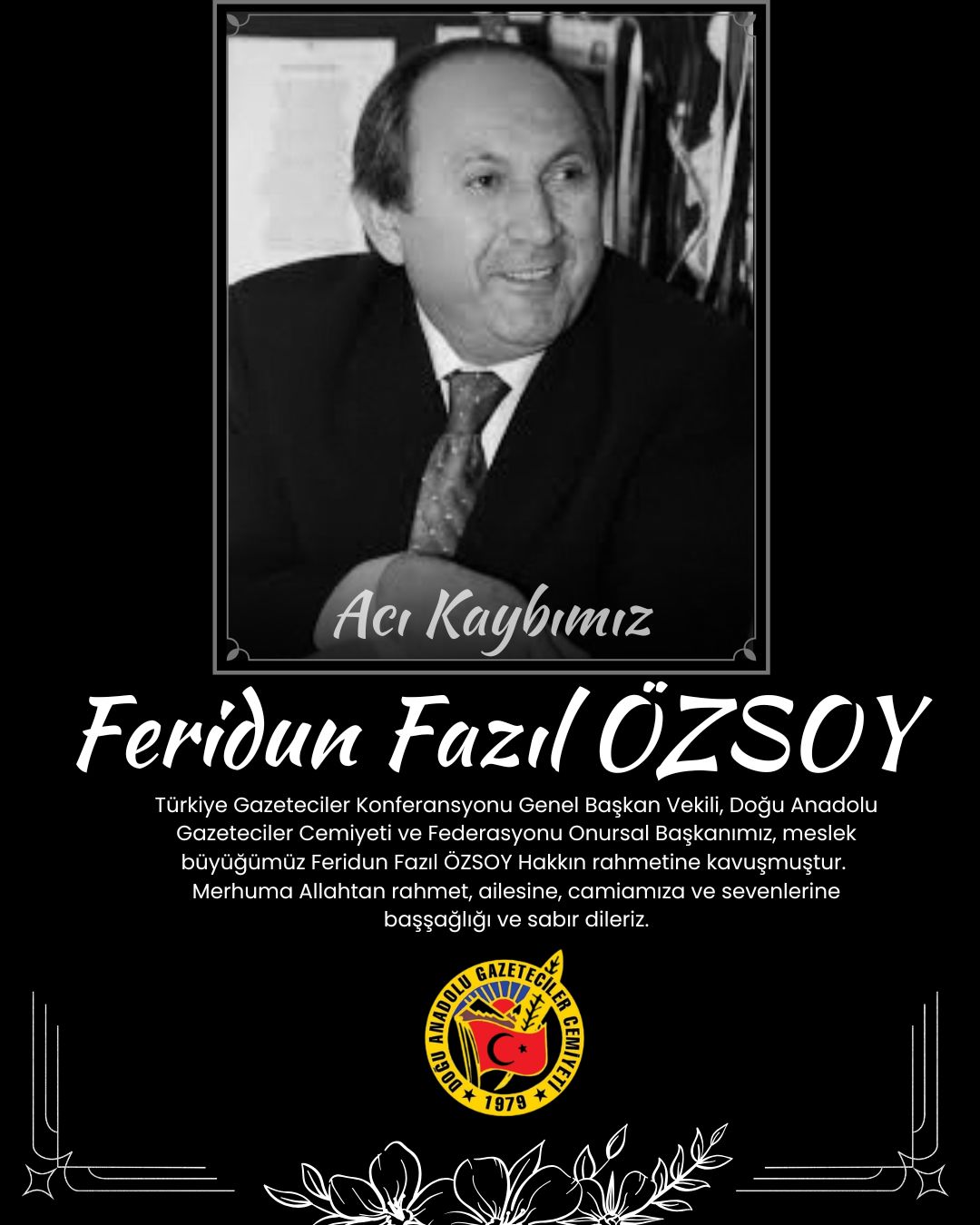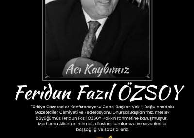 Doğu Anadolu basınının ulu çınarı, cemiyetimizin ve federasyonumuzun Onursal Başkanı, yol göstericimiz ve kıymetli ağabeyimiz Feridun Fazıl Özsoy’u kaybetmenin derin ve tarif edilemez üzüntüsünü yaşıyoruz.